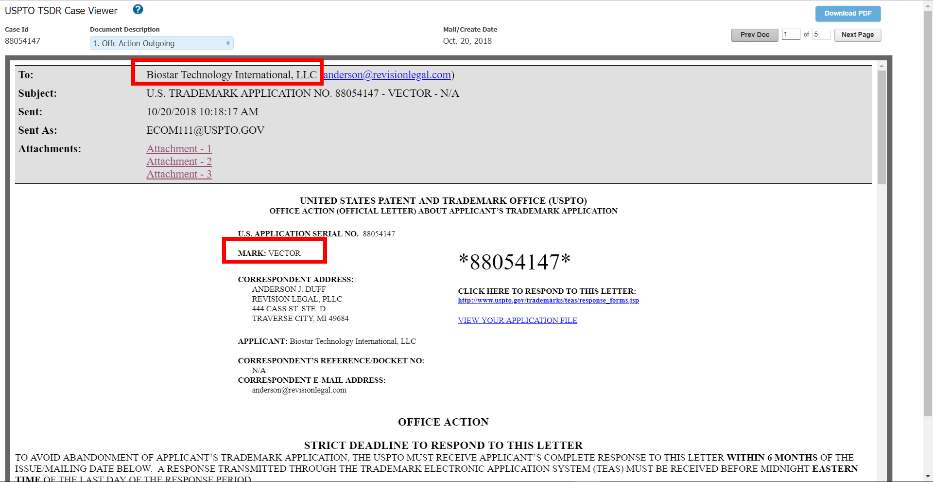 DKG Vector vs Biostar - new application - filed - trademark vector - 3 - pending again - sept 2018.pdf